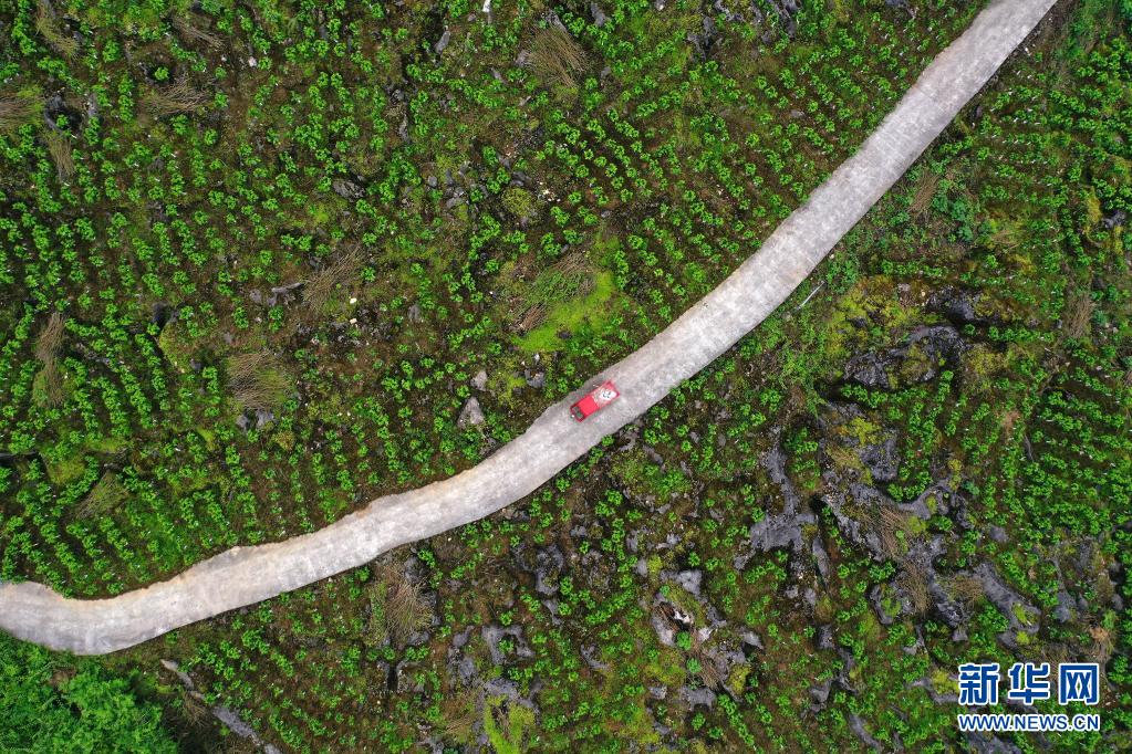 5月8日,在重庆市黔江区濯水镇双龙村,村民驾驶农用车行进在桑园间的道路上(无人机照片)。