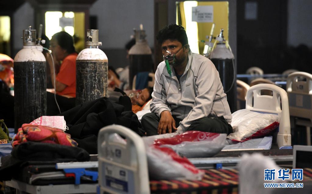 5月8日,新冠患者在印度新德里的一处隔离中心吸氧。