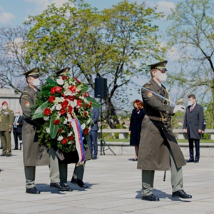 5月8日,在捷克首都布拉格,士兵参加敬献花圈仪式。