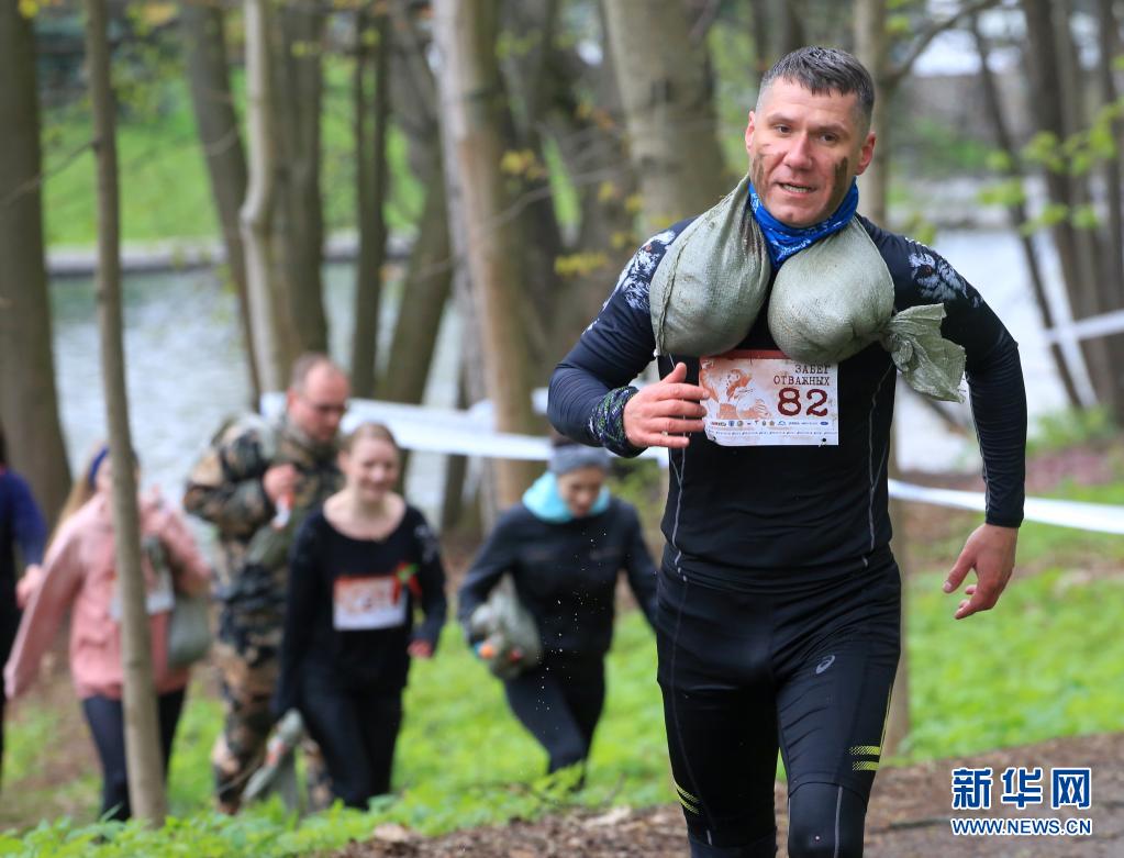 5月8日,在白俄罗斯明斯克举行的“勇敢者赛跑”活动上,一名男子扛着沙袋前行。