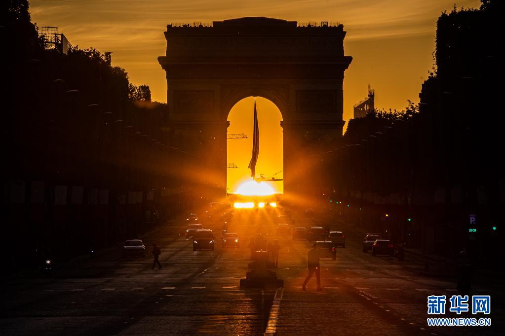 这是5月8日在法国巴黎香榭丽舍大街拍摄的凯旋门落日景象。