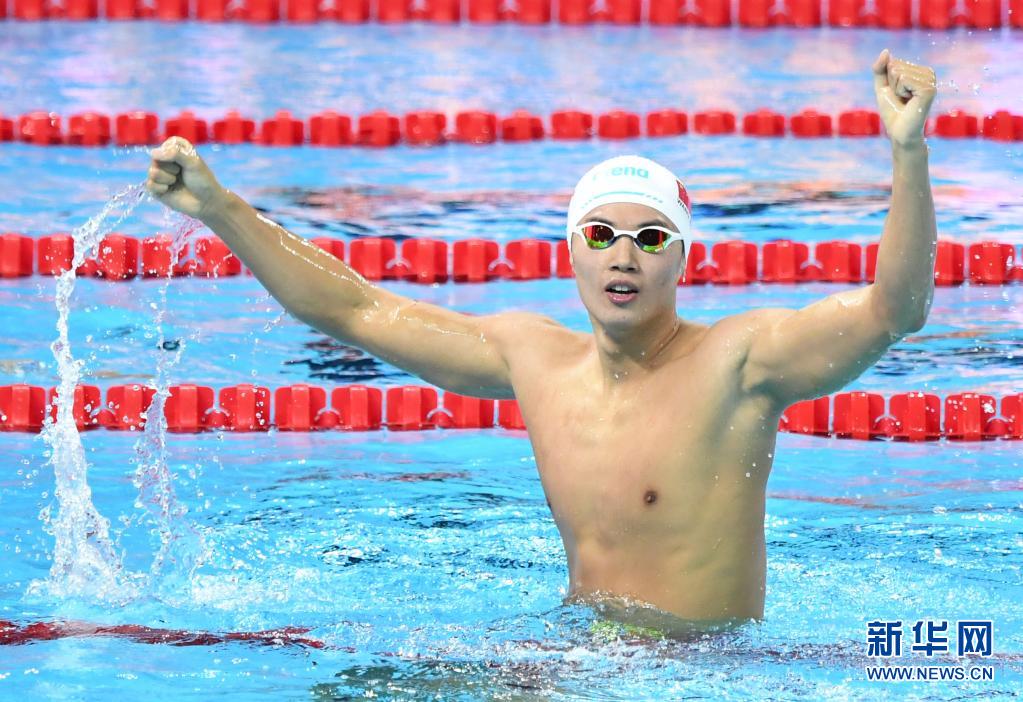 在浙江杭州举行的2018国际泳联短池游泳世界锦标赛男子200米混合泳决赛中,汪顺以1分51秒01的成绩夺得冠军,为中国队夺得本届世锦赛首金,这是汪顺在比赛后庆祝(2018年12月11日摄)。新华社记者翁忻旸摄