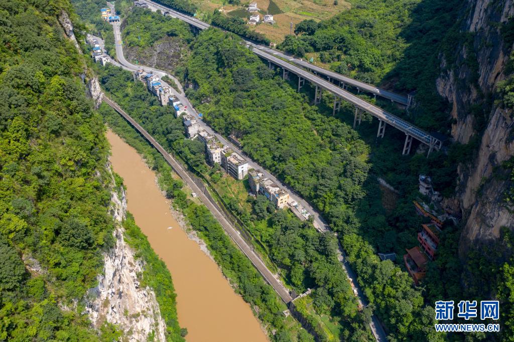 在云南昭通市盐津县豆沙镇,从空中俯瞰“五道并行”,从江边算起,一眼可见关河水道、内昆铁路、G247公路、五尺道和渝昆高速五道并行(2020年8月10日摄,无人机全景照片)。新华社记者 江文耀 摄