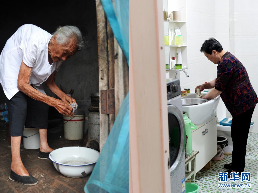这是一张拼版照片,左图为2011年8月18日,许张氏在准备给儿子许金义清洗身子所用的毛巾(新华社记者刘军喜摄);右图为2021年5月7日,许长荣在准备热水给许金义洗头(新华社记者黄博涵摄)。