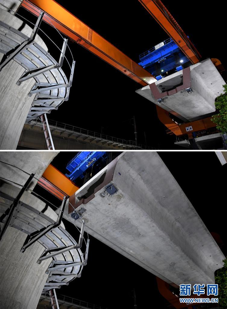 在郑济铁路郑州东站附近的施工现场,箱梁在架设中(5月9日摄,拼版照片)。