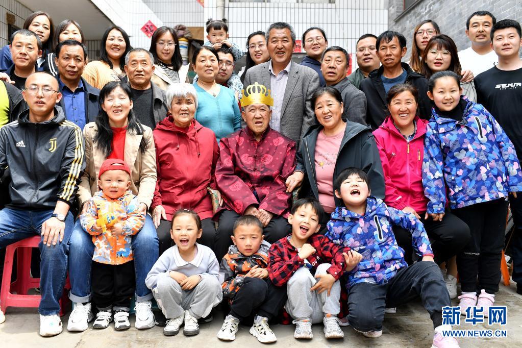 胡在忠(中)和家人在院子里拍摄全家福照片(2021年4月24日摄)。 新华社记者 詹彦 摄