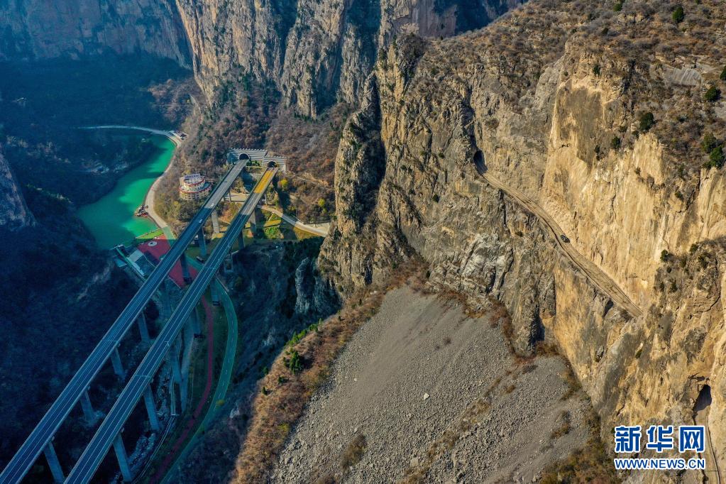 山西省长治市平顺县虹梯关乡虹霓村的村民如今出行有了高速公路(左),过去出行只有“挂壁公路”(右)(2020年11月12日摄,无人机照片)。 新华社记者 曹阳 摄