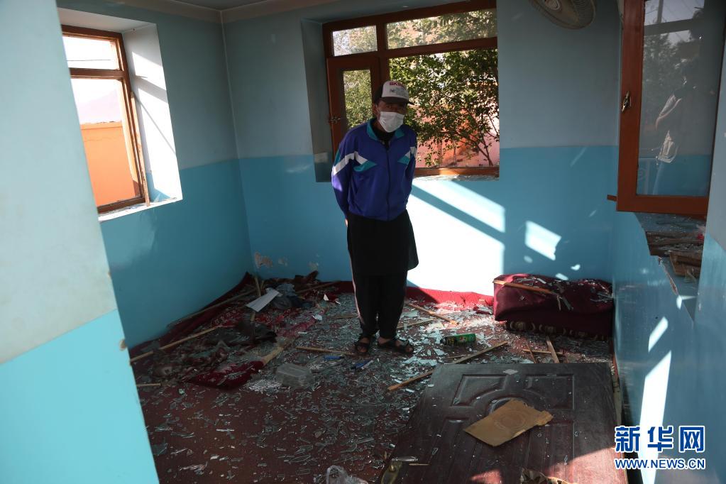 5月9日,一名男子站在阿富汗喀布尔爆炸现场附近受损的房间内。