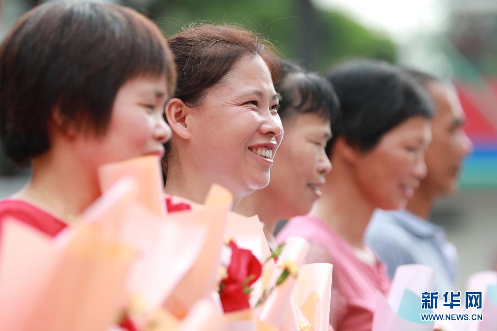 5月9日,在厦门市同安区消防救援大队,母亲们手捧鲜花在消防车前拍照留影。