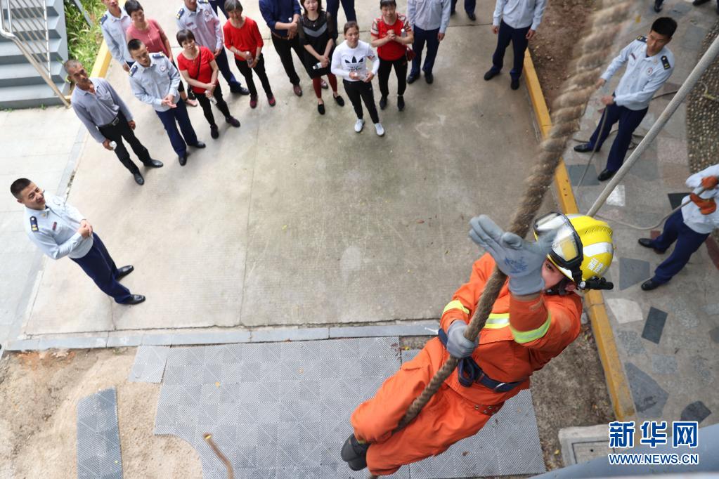 5月9日,在厦门市同安区消防救援大队,一名消防员为母亲们展示消防业务技能。