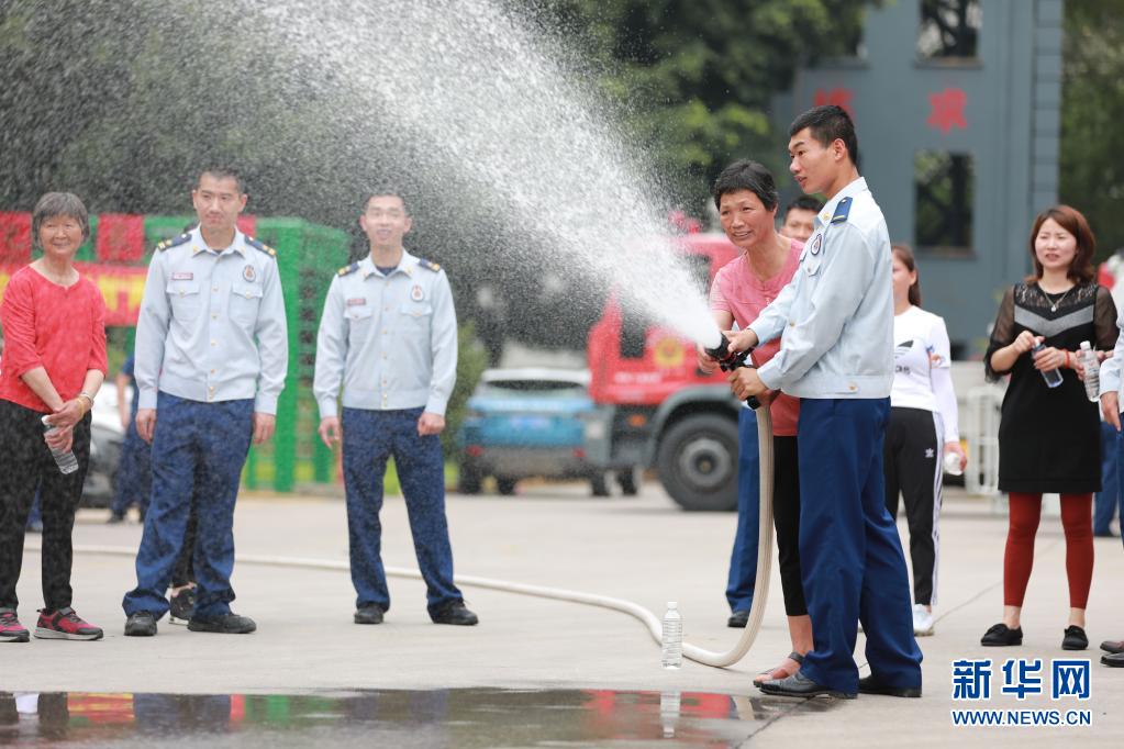 5月9日,在厦门市同安区消防救援大队,消防员叶佳礼指导母亲叶美芳体验水枪出水“灭火”。