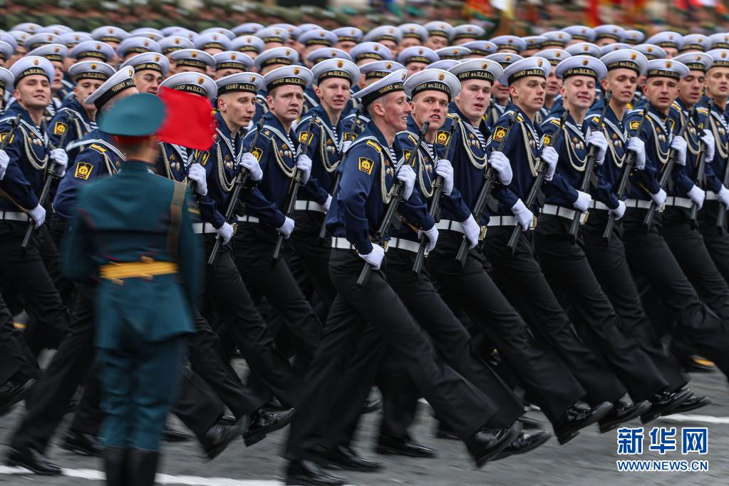 5月9日,在俄罗斯莫斯科举行的胜利日阅兵式上,士兵列队走过红场。