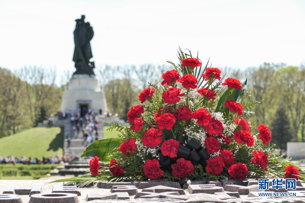 这是5月9日在德国首都柏林特雷普托苏军烈士陵园拍摄的花束。