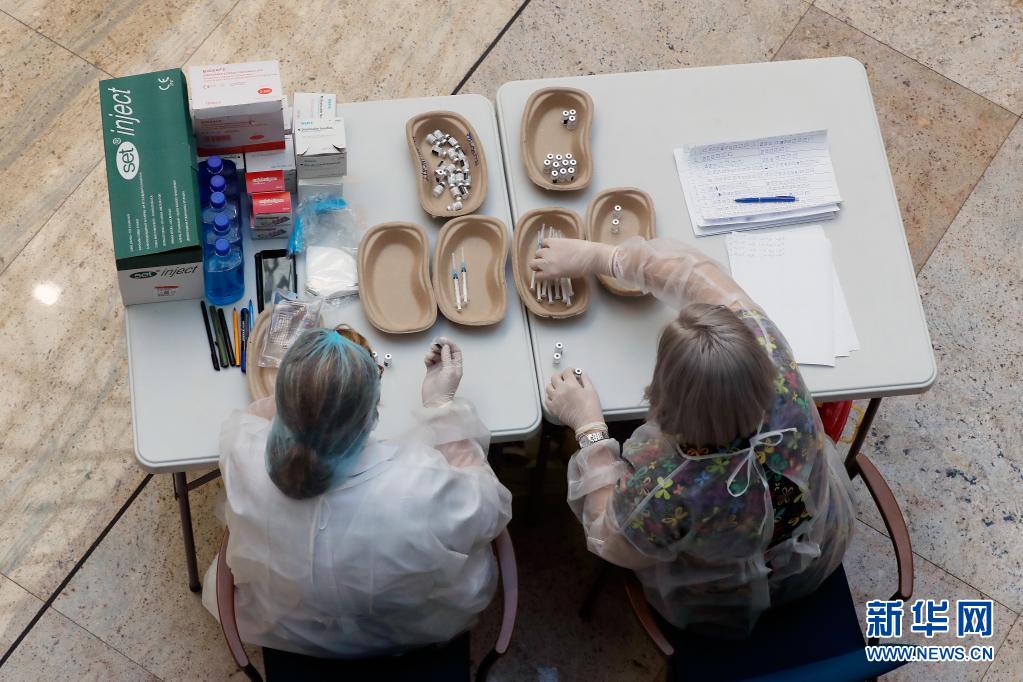 5月9日,工作人员在罗马尼亚首都布加勒斯特的国家图书馆疫苗接种点为民众接种新冠疫苗。