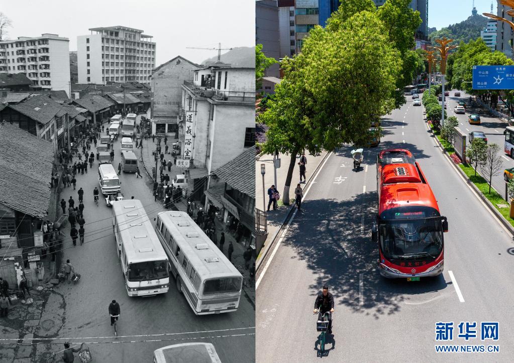 这是一张拼版照片,左图为:遵义市中华南路(资料照片);右图为:2021年4月29日拍摄的遵义市中华南路(新华社发 陈庆军 摄)。 新华社发