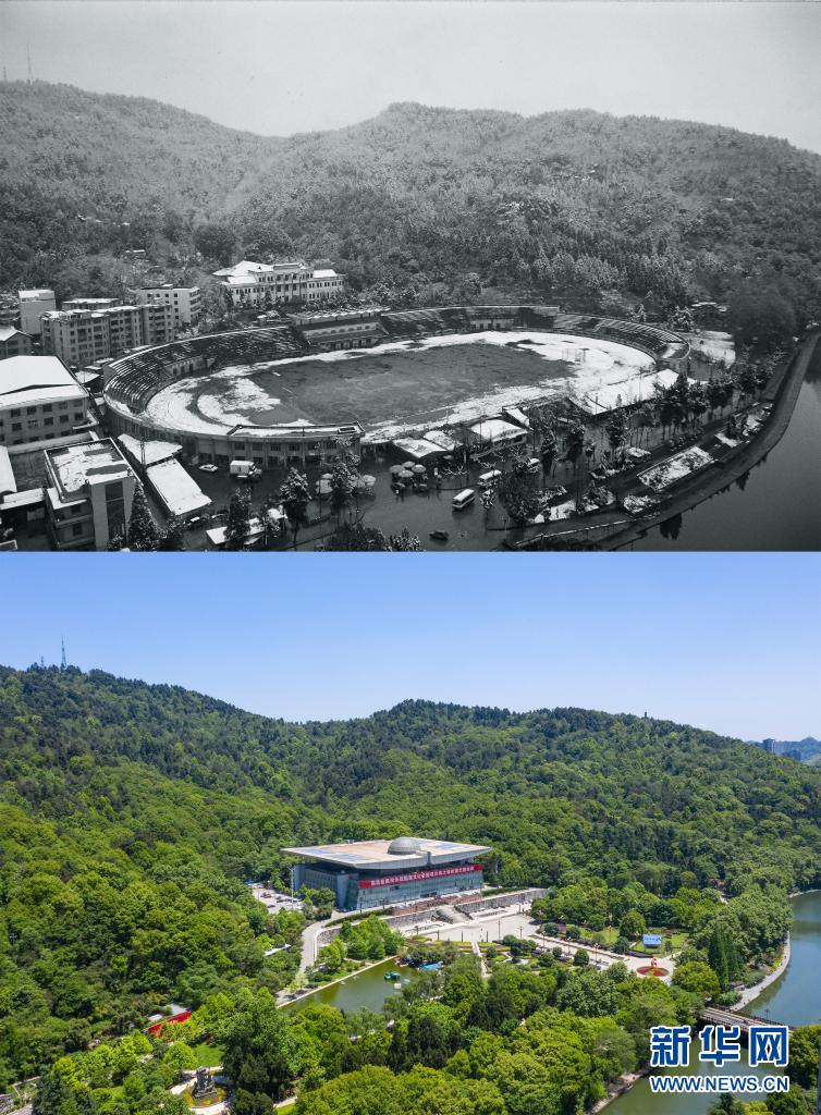 这是一张拼版照片,上图为:遵义市凤凰山体育场(资料照片);下图为:2021年4月29日拍摄的遵义市凤凰广场(无人机照片,新华社发 陈庆军 摄)。 新华社发