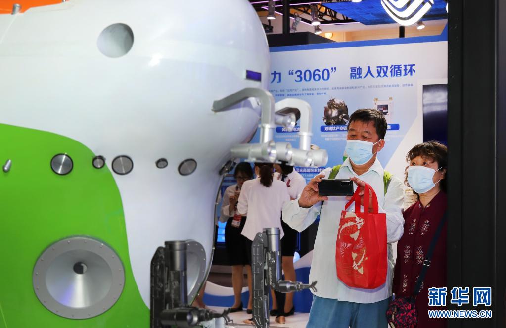 5月10日,参观者在观看“奋斗者”号全海深载人潜水器模型。