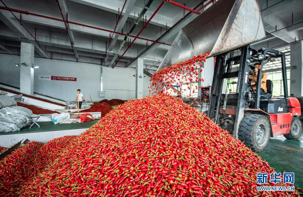工人在贵州遵义市新蒲新区一家辣椒加工企业内转运辣椒(2020年8月13日摄)。新华社记者 陶亮 摄