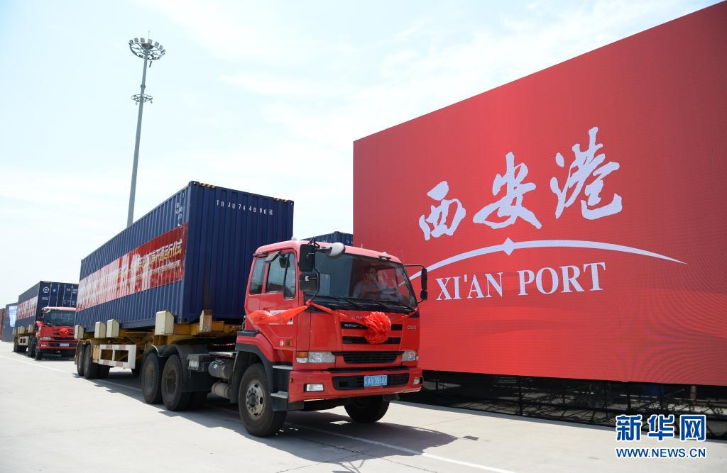 “乘坐”中欧班列抵达西安的进口沃尔沃汽车从西安港西安铁路集装箱中心站运出(2018年6月13日摄)。