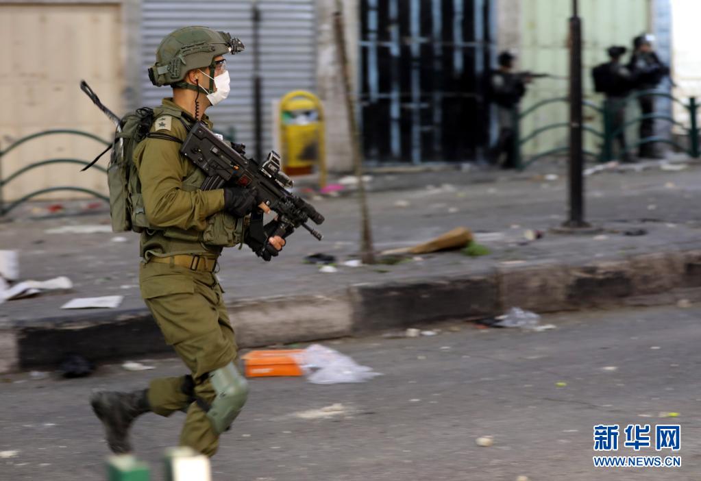 5月10日,以色列边防警察在约旦河西岸城市希伯伦街头举枪应对抗议的巴勒斯坦人。