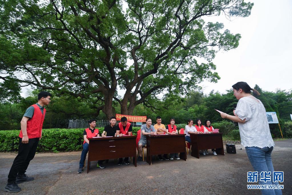 5月11日,在林城镇太傅村600年的古香樟树下,基层党员参加党史知识竞赛活动,迎接建党百年。