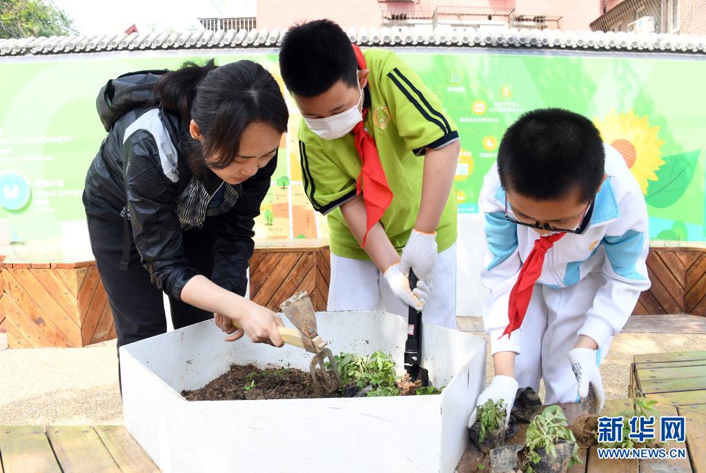 5月11日,街道工作人员(左一)与北京市海淀区双榆树中心小学的学生一起在双榆树西里二条种植绿植。