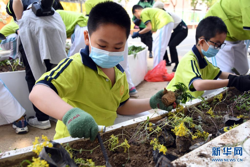 5月11日,北京市海淀区双榆树中心小学的学生在双榆树西里二条种植绿植。