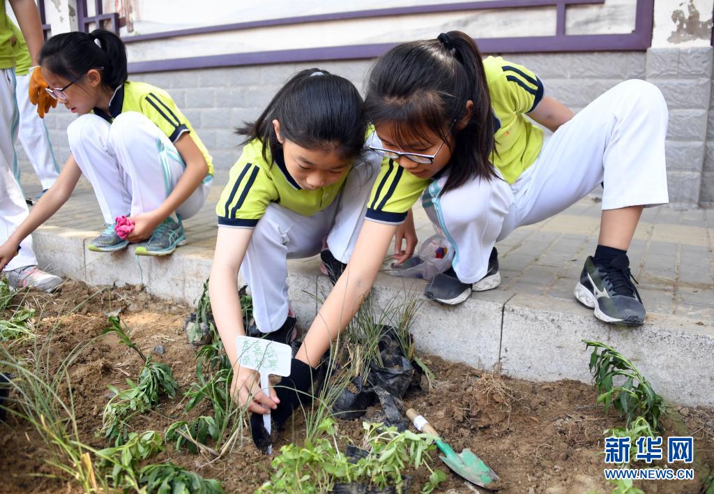 5月11日,北京市海淀区双榆树中心小学的学生为种植好的植物放置标识牌。
