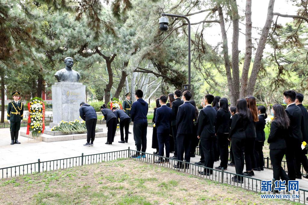 4月5日,学生在北京大学里的李大钊雕像前祭奠。新华社发(北京大学供图)