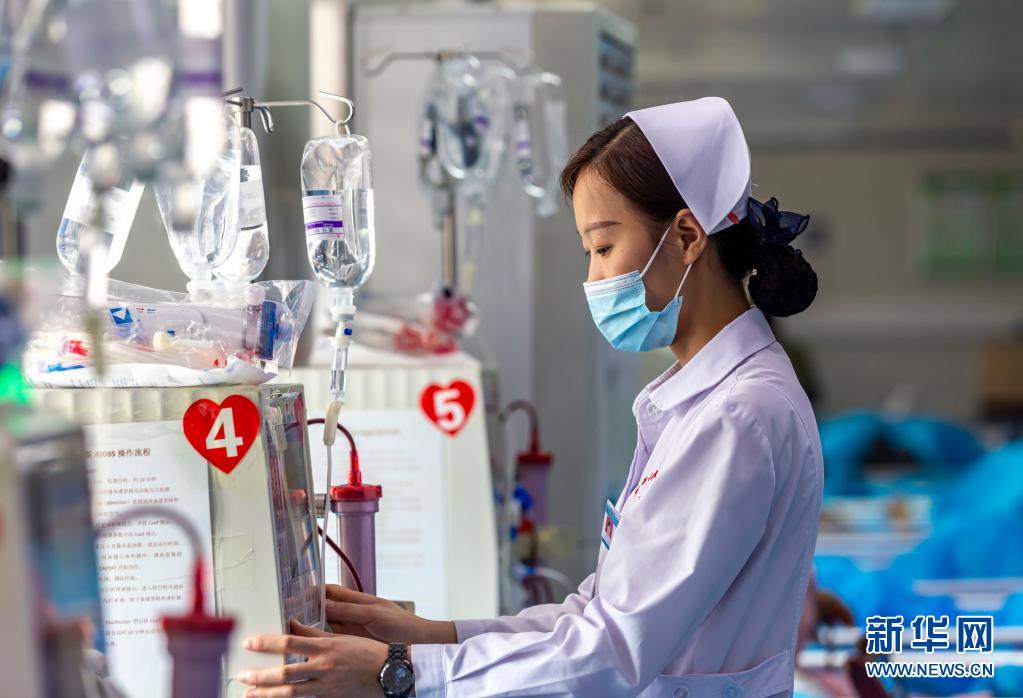 5月11日,护士在贵州省黔西市人民医院血透室核对透析参数。