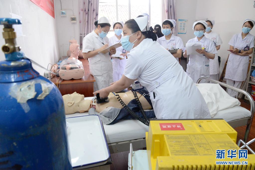 5月11日,江西省抚州市南丰县人民医院的护士在进行除颤技能竞赛。