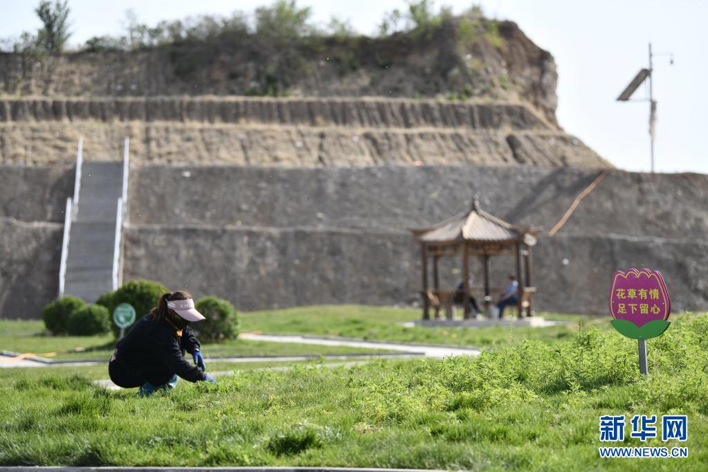 5月11日,工人在唐山市丰润区压库山片区矿山地质环境综合治理项目现场养护草地。