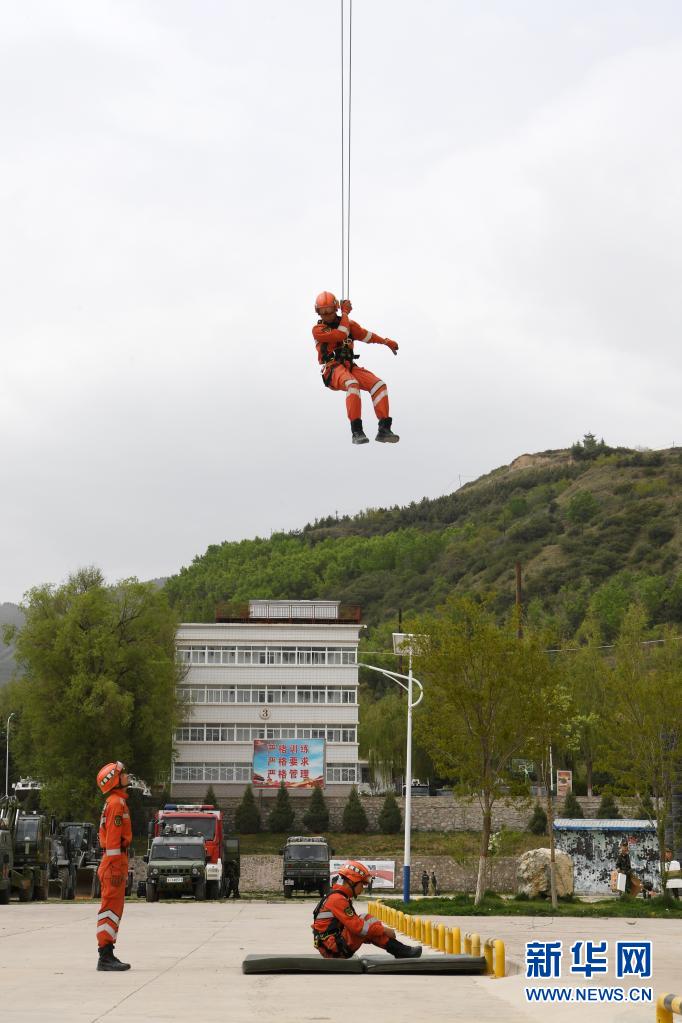 在兰州国家陆地搜寻与救护基地,武警甘肃总队机动支队战士进行绳索救援技术训练(5月10日摄)。