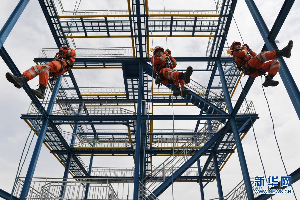 在兰州国家陆地搜寻与救护基地,武警甘肃总队机动支队战士进行绳索救援技术训练(5月10日摄)。