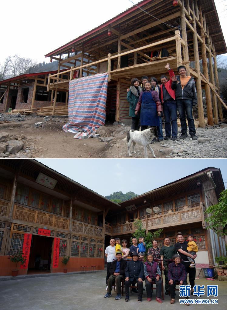 这是一张拼版照片,上图为林兴聪(右二)、李芸香(右三)和家中的老人、孩子在重建中的住房前留影(2009年1月25日,新华社记者江毅摄);下图为林兴聪(后右三)、李芸香(后右四)一大家13 口人在房前留影(2021年5月4日,新华社记者江宏景摄)。