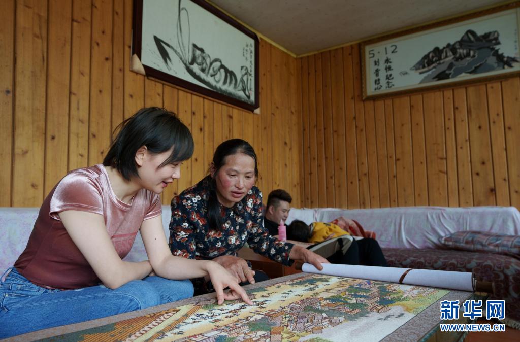 5月6日,李芸香(左二)给女儿林苓介绍她花4年时间绣的《清明上河图》十字绣作品。 新华社记者 江宏景 摄