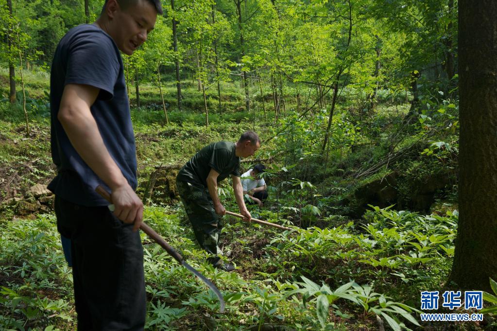 5月4日,林兴聪(中)和儿子林顺坪(左)、女婿刘永锋为地里种植的药材除杂草。 新华社记者 江宏景 摄