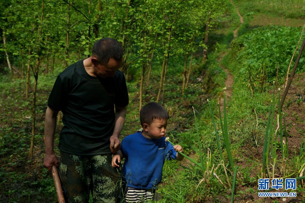 5月4日,林兴聪带着孙儿林关邱栩去地里劳作。 新华社记者 江宏景 摄