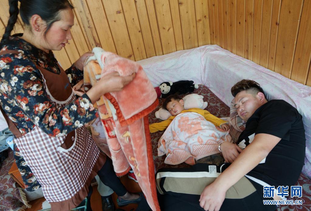 5月4日,李芸香(左)给午睡的儿子邱超(右)、孙子邱早睿盖毛毯。 新华社记者 江宏景 摄