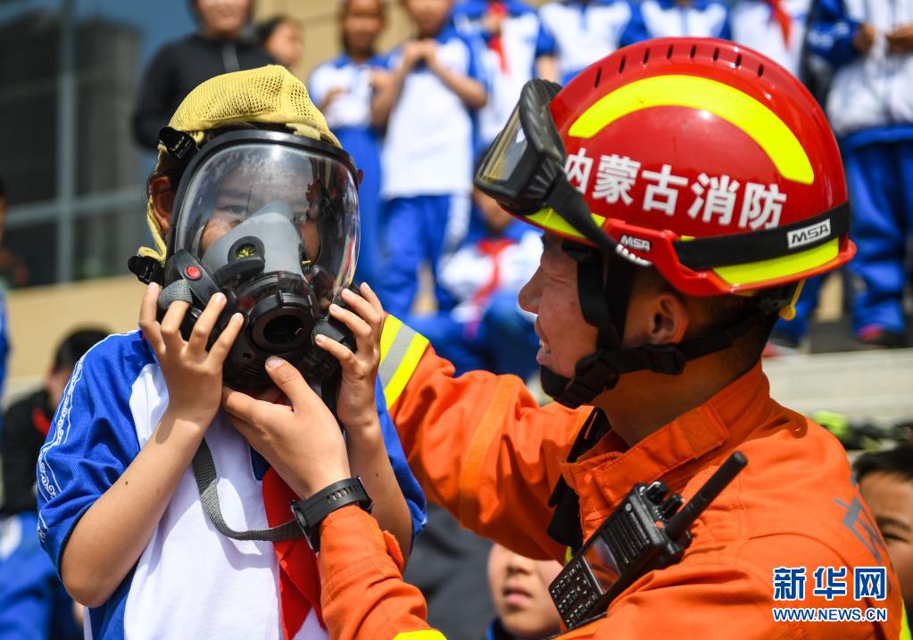 5月12日,内蒙古师范大学第二附属学校小学部的学生在呼和浩特市赛罕区消防救援大队指战员的指导下体验空气呼吸器。