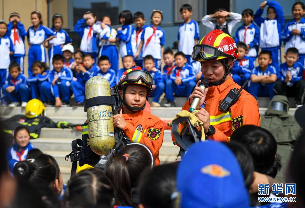 5月12日,呼和浩特市赛罕区消防救援大队的指战员为内蒙古师范大学第二附属学校小学部的学生讲解消防装备的使用方法。
