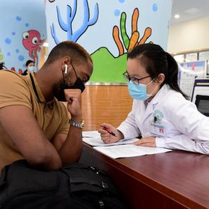 5月12日,在合肥市一处新冠疫苗接种点,医务人员对外籍人士进行接种前病史筛查。