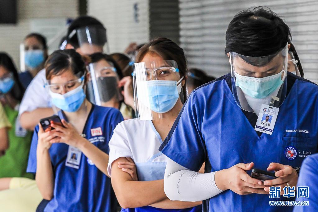 5月12日,在菲律宾马尼拉一所医院,护士们排队领取慰问品。