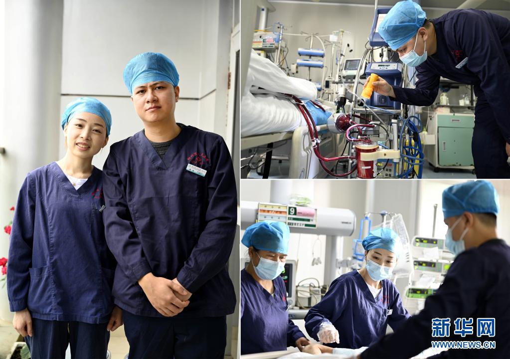 拼版照片:左图为5月12日,在广西柳州市人民医院,护士施佳(右)与同是护士的妻子蓝玲合影;右上图为5月12日,施佳在重症医学科病房检查仪器使用情况;右下图为5月12日,蓝玲(中)与同事在重症医学科病房护理病人。