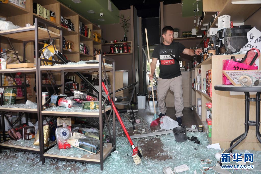 5月12日,以色列中部城市霍隆遭受加沙地带火箭弹袭击后,一名男子清理一片狼藉的街边店铺。