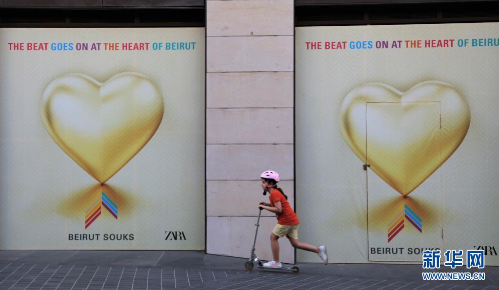 5月12日,一名女孩在黎巴嫩首都贝鲁特市中心空荡的商业区玩滑板车。