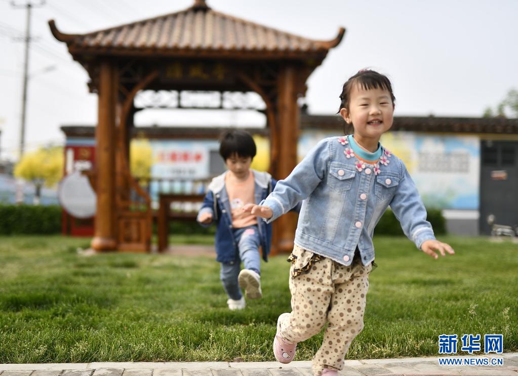 5月13日,孩子们在河北省唐山市丰南区胥各庄镇岭子上村的游园内玩耍。
