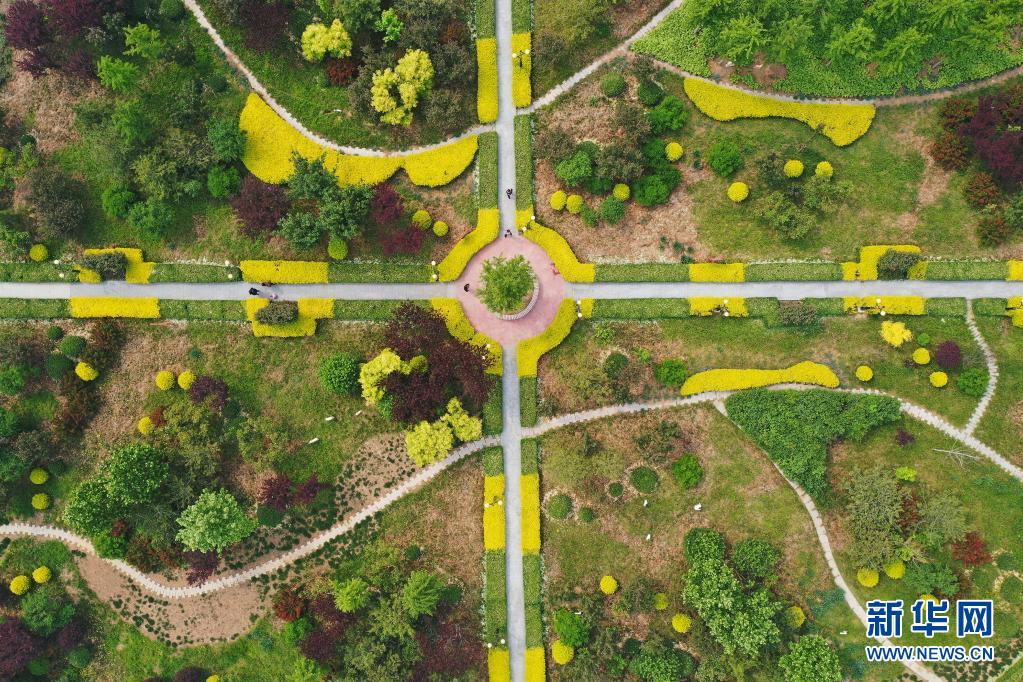 5月13日拍摄的河北省唐山市丰南区黄各庄镇双坨村的游园(无人机照片)。