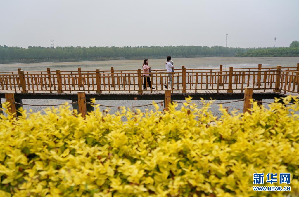 5月13日,村民在河北省唐山市丰南区东田庄乡王打刁村木栈道上行走。