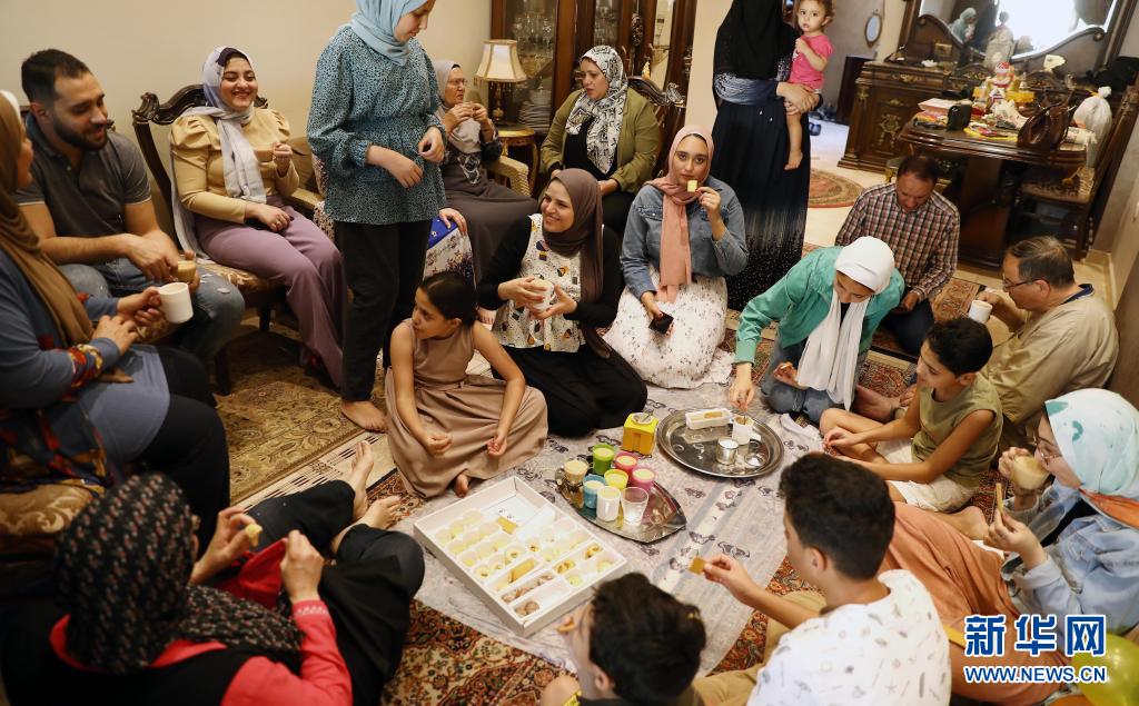 5月13日,人们在埃及开罗的家中品尝甜点,庆祝开斋节。